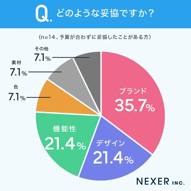 妥協したポイントで最も多かったのは「ブランド(有名ブランドを避けた)」。その他「デザイン」や「機能性」を諦めたケースもありました。